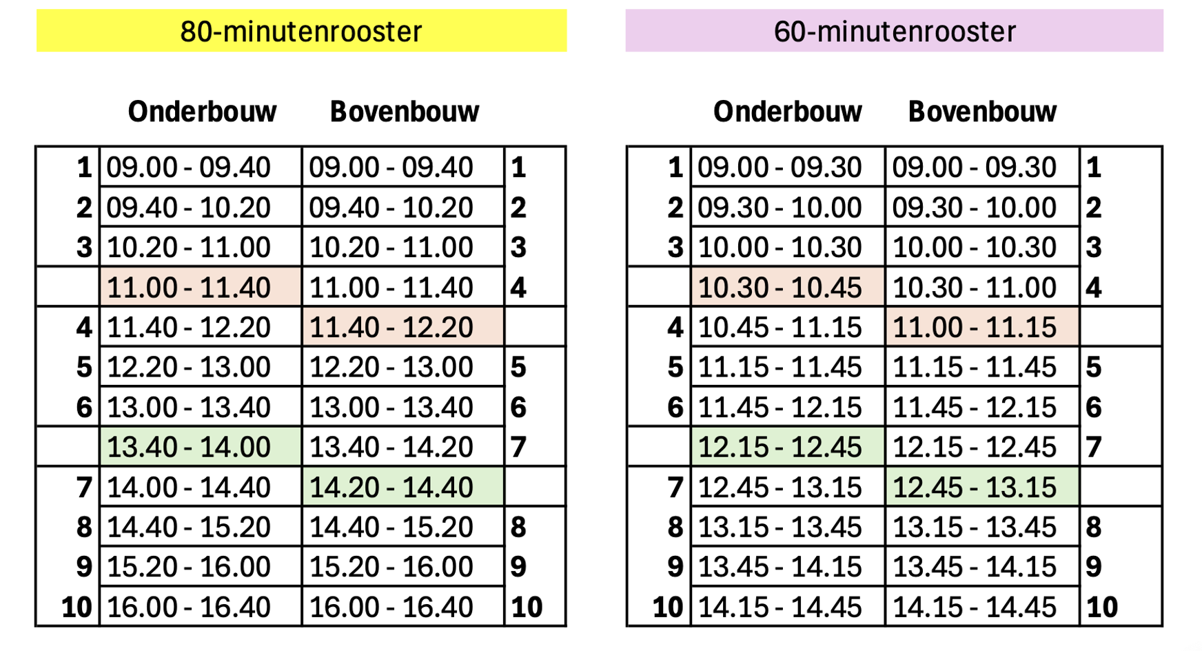 Onderstaand zijn twee versies van het rooster te zien: het reguliere 80-minutenrooster en het 60-minutenrooster voor dagen met vergaderingen of studiemiddagen. Het actuele rooster van een leerling en eventuele roosterwijzigingen zijn zichtbaar via Magister.